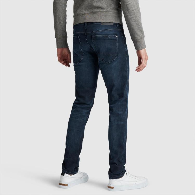 Deze donkerblauwe jeans van PME Legend combineert robuuste denim met een moderne tapered fit. Het model heeft een klassieke vijf-pocket indeling en wordt gesloten met een ritsknopsluiting. De jeans toont subtiele slijtageplekken die het stoere karakter van het merk benadrukken. Opvallend detail is het kleine merklabel op de achterzak.