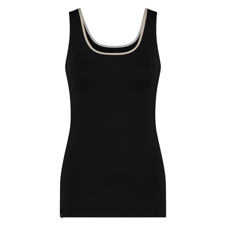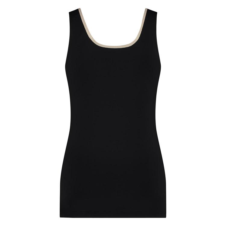 Deze zwarte mouwloze top van NUKUS is een effen kledingstuk. De Nukus Top SS23106 heeft een aansluitende pasvorm en valt comfortabel door de samenstelling van 90% Polyamide en 10% Elastaan. Je ziet een ronde halslijn, die samen met de armsgaten, is afgewerkt met een lichte contrasterende bies. Dit detail geeft de top een kenmerkende uitstraling en maakt het een veelzijdig basisstuk.