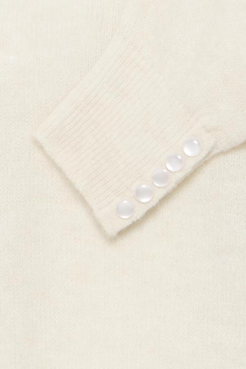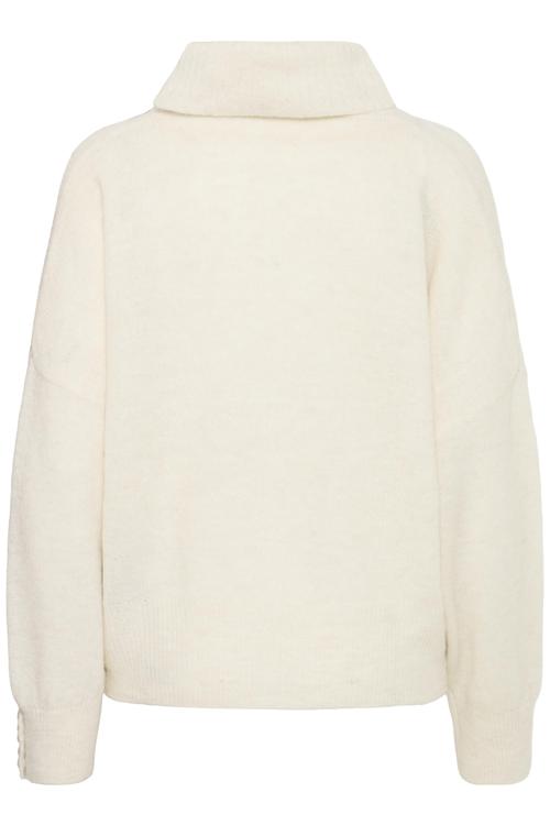 Deze crèmekleurige trui kenmerkt zich door zijn karakteristieke colkraag die je op verschillende manieren kunt dragen. De zachte stofmix met alpaca voelt warm en comfortabel aan tegen je huid, terwijl het elastaan zorgt voor een prettige pasvorm die meebeweegt. De lange mouwen hebben decoratieve knopen bij de polsen die het kledingstuk een verfijnde uitstraling geven. Het ontwerp heeft een relaxte pasvorm die ruim valt zonder te verhullen.