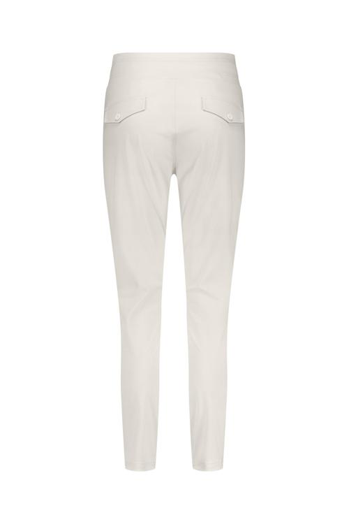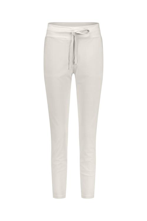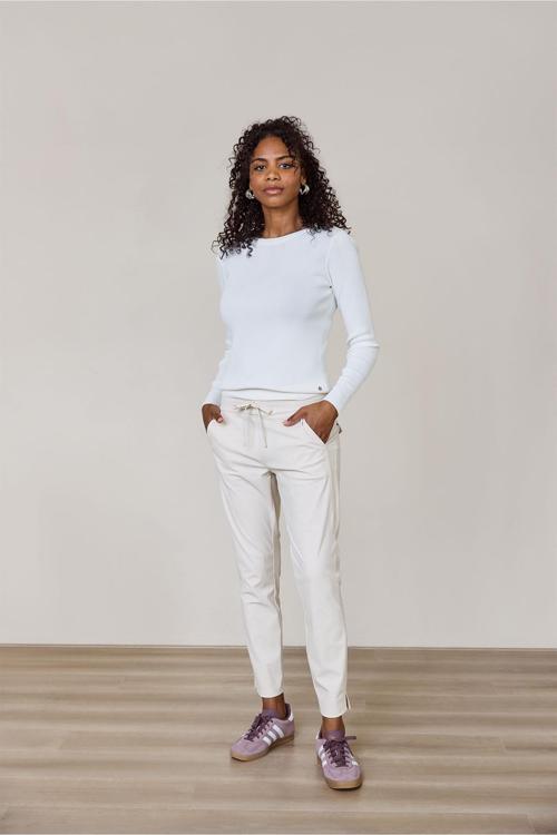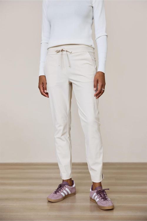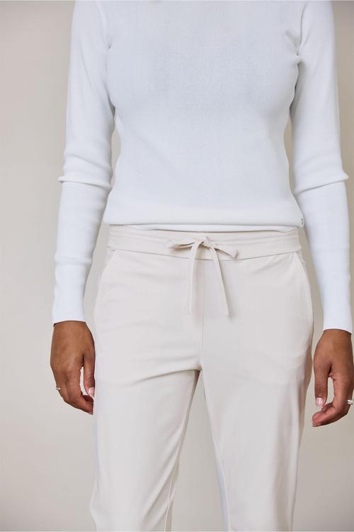 Deze crèmekleurige broek combineert comfort met een moderne uitstraling. Het zachte materiaal met stretch zorgt voor bewegingsvrijheid en draagcomfort gedurende de hele dag. De elastische tailleband met aantrekkoord biedt een verstelbare pasvorm, terwijl de taps toelopende pijpen je silhouet flatteren. Opvallende details zijn de decoratieve stiknaden bij de achterzakken die het ontwerp een eigentijdse touch geven.