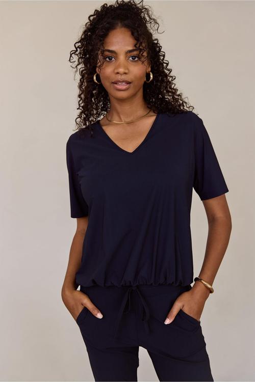 Deze elegante donkerblauwe top heeft een vrouwelijke V-halslijn die je decolleté mooi accentueert. Het kledingstuk valt soepel om je lichaam door de hoogwaardige mix van polyamide en elastaan, wat zorgt voor bewegingsvrijheid en vormvastheid. De korte mouwen reiken tot halverwege je bovenarmen en de elastische tailleband onderaan creëert een subtiel blouson-effect dat je taille flatterend omlijnt.