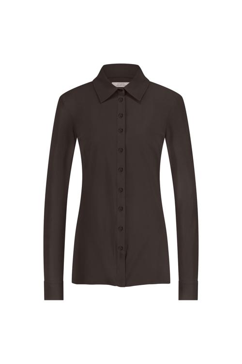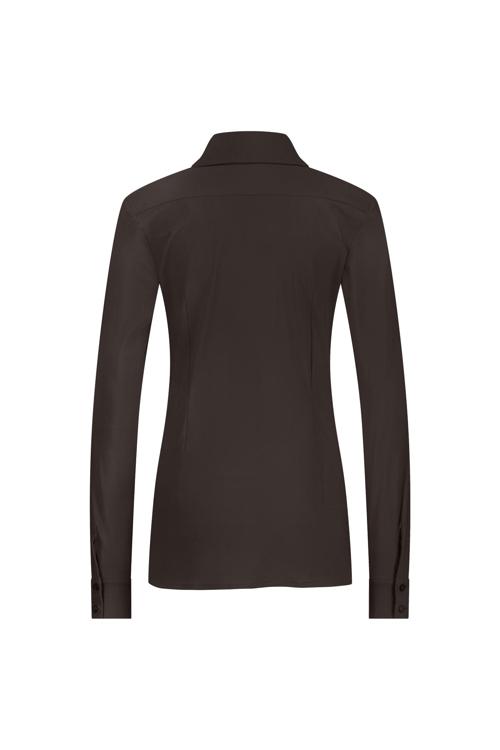 Deze stijlvolle bruine blouse heeft een klassieke uitstraling met een vrouwelijke pasvorm. Het donkerbruine kledingstuk is voorzien van lange mouwen en een puntkraag die zorgen voor een nette afwerking. De doorlopende knoopsluiting aan de voorzijde maakt het makkelijk om de blouse aan te trekken. Dankzij de stretchstof met polyamide en elastaan beweegt het comfortabel mee met je lichaam, terwijl het gerecyclede polyester bijdraagt aan bewuste keuzes in je garderobe.