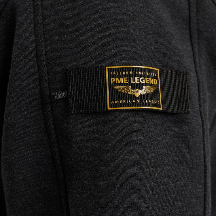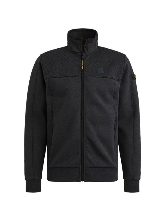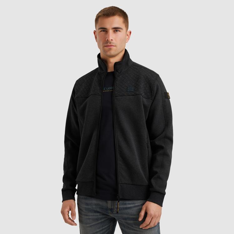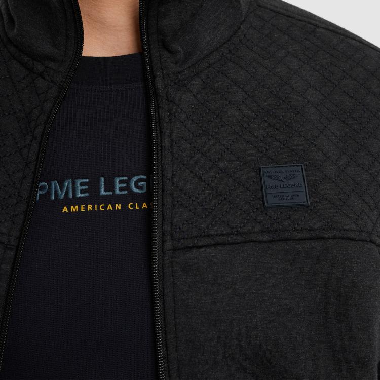 Deze zwarte sweater van PME Legend kenmerkt zich door de stoere uitstraling met een opstaande kraag en doorlopende ritssluiting. Het quilted patroon op het borststuk geeft de trui extra textuur en karakter. De katoenrijke stof (80% cotton, 15% polyester, 5% elastane) voelt comfortabel aan en biedt bewegingsvrijheid door het elastane. Het logo op de linker mouw onderstreept de authentieke PME Legend identiteit.