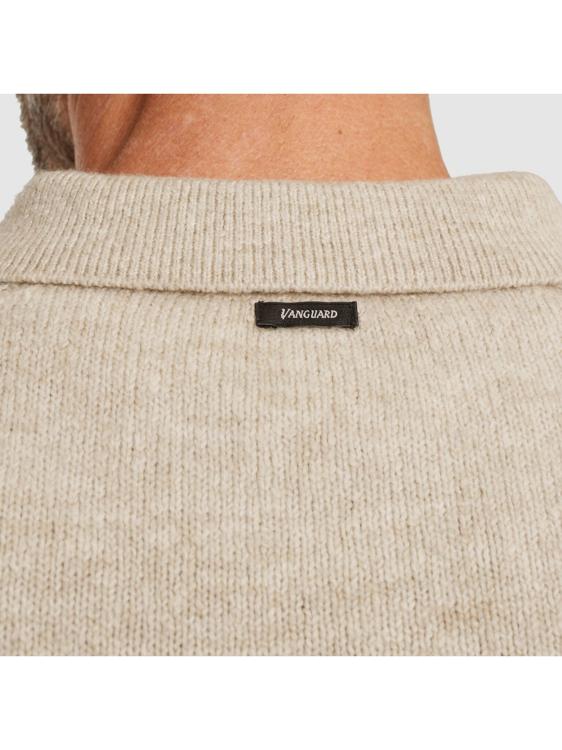 Deze beige gebreide trui van Vanguard kenmerkt zich door de polokraag met halve ritssluiting en contrasterende details. De trui heeft lange mouwen en een borstzakje aan de linkerzijde. Het fijngebreide materiaal geeft de pullover een verfijnde textuur, terwijl het donkere Vanguard-label subtiel in de halslijn is verwerkt.