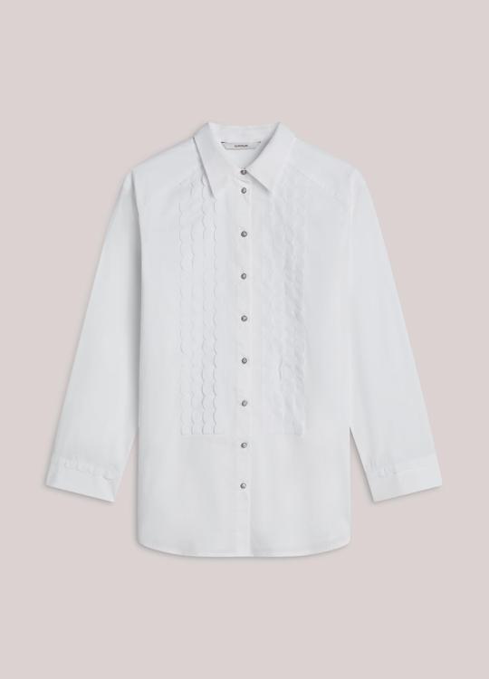 Deze witte blouse van Summum heeft een klassieke puntkraag en doorlopende knoopsluiting. De katoenmix van 65% cotton en 35% polyester voelt comfortabel aan en behoudt zijn vorm gedurende de dag. De lange mouwen hebben manchetten met knopen voor een verzorgde afwerking. Het licht oversized model valt soepel en biedt bewegingsvrijheid.