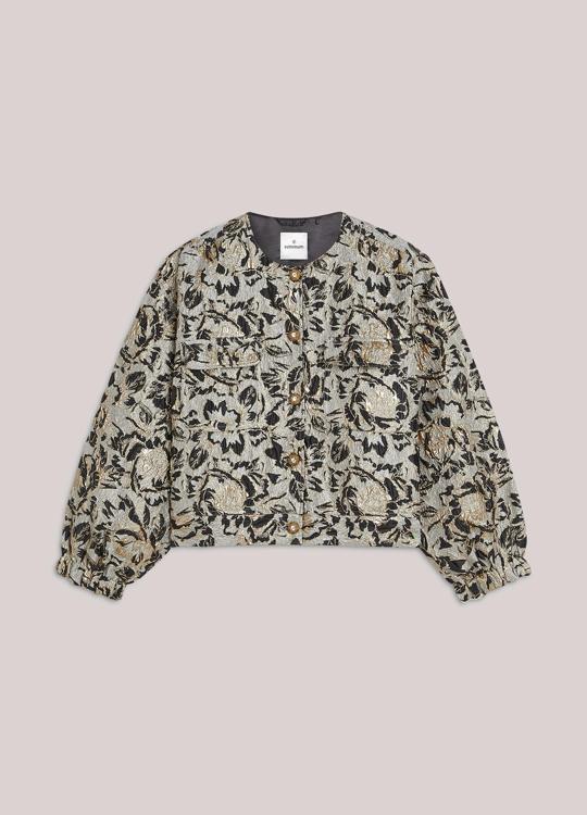 Dit korte jasje van Summum kenmerkt zich door een verfijnd bloemendessin in beige en zwarte tinten. Het lichte materiaal van polyester met viscose voelt soepel aan en biedt je bewegingsvrijheid. De lange mouwen hebben een licht balloneffect en sluiten met elastische boorden aan de polsen. Het jasje heeft een ritssluiting aan de voorkant en valt kort op de heupen.