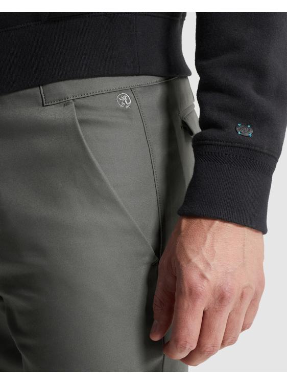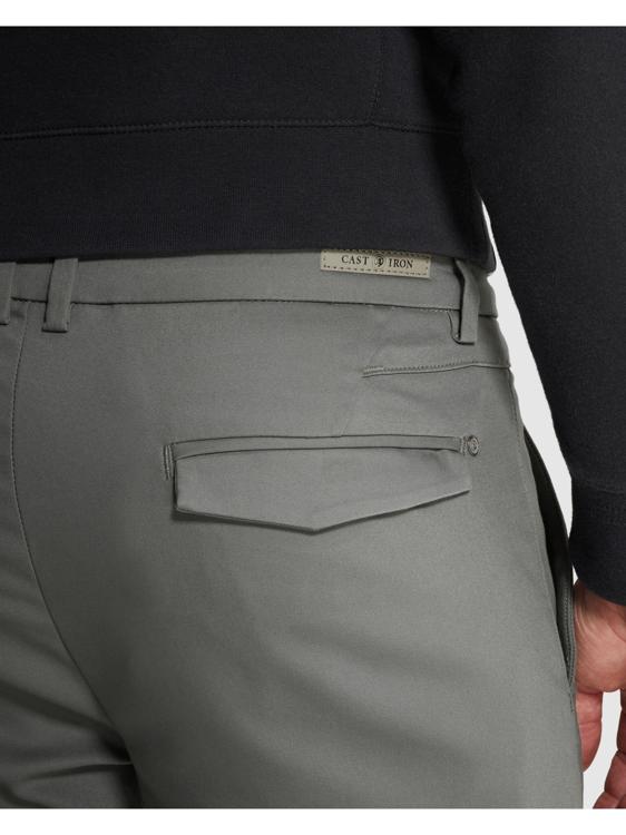 Deze groene herenbroek van Cast Iron combineert een stoere uitstraling met moderne pasvorm. De broek heeft een slim fit die mooi aansluit zonder te knellen. Het model kenmerkt zich door de opvallende metalen knoop met logo en de subtiele steekzakken aan de voorkant. De achterzijde toont twee paspelzakken die het design een nette afwerking geven.