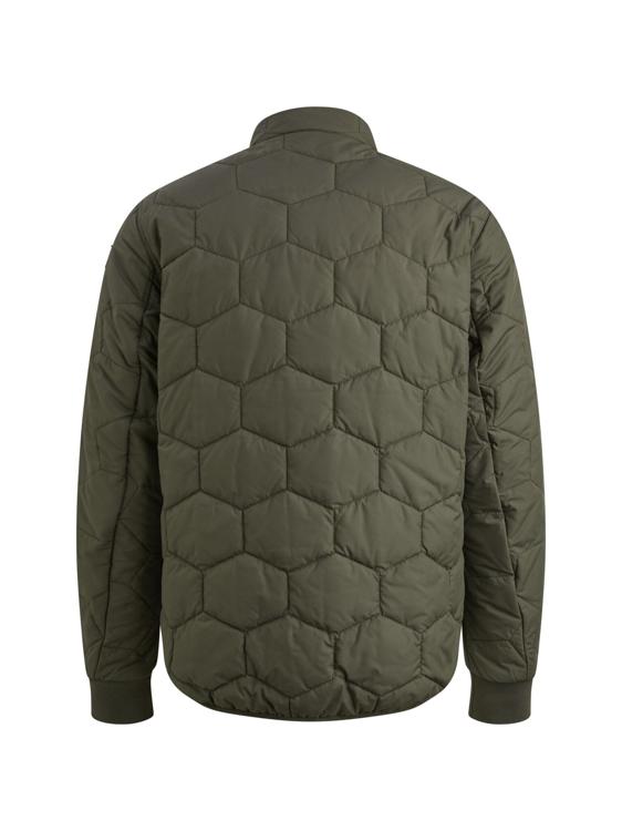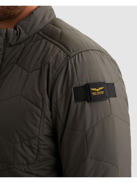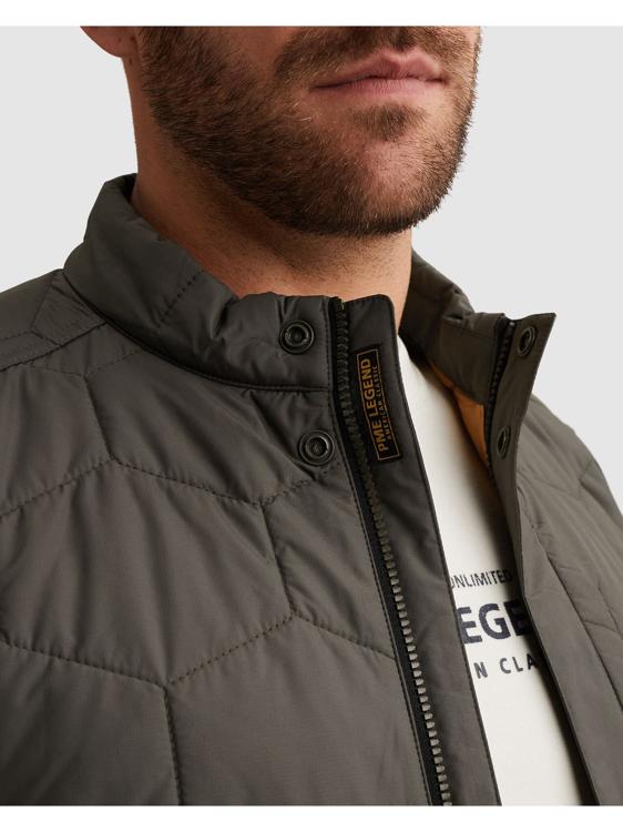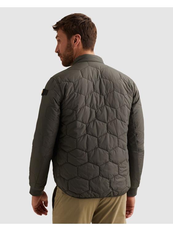 Deze donkergroene gewatteerde jas van PME Legend biedt warmte zonder extra volume. Het opvallende hexagonale stikpatroon geeft het kledingstuk een stoere uitstraling. De ritssluiting loopt door tot aan de bovenkant van de kraag. Opvallend detail is het zwarte PME Legend label op de linkermouw. De elastische boorden aan de mouwen en zoom zorgen voor een goede pasvorm en houden de kou buiten.