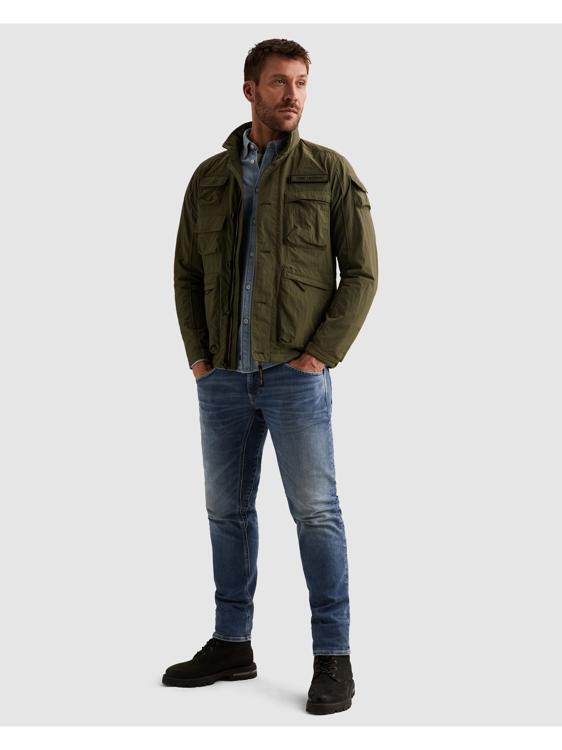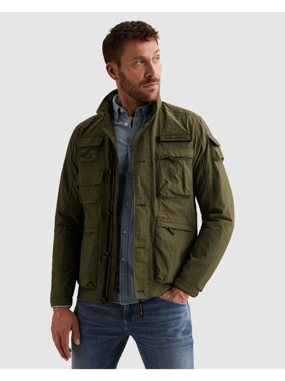Dit legergroene jack van PME Legend kenmerkt zich door zijn robuuste uitstraling met meerdere borstzakken en een opstaande kraag. De kleur olijfgroen geeft het jack een stoere uitstraling. Je ziet duidelijk de knoopsluiting aan de voorkant en de praktische zakken met kleppen die het jack functioneel maken. De lange mouwen en het lichtgewicht materiaal maken dit jack geschikt voor het tussenseizoen.
