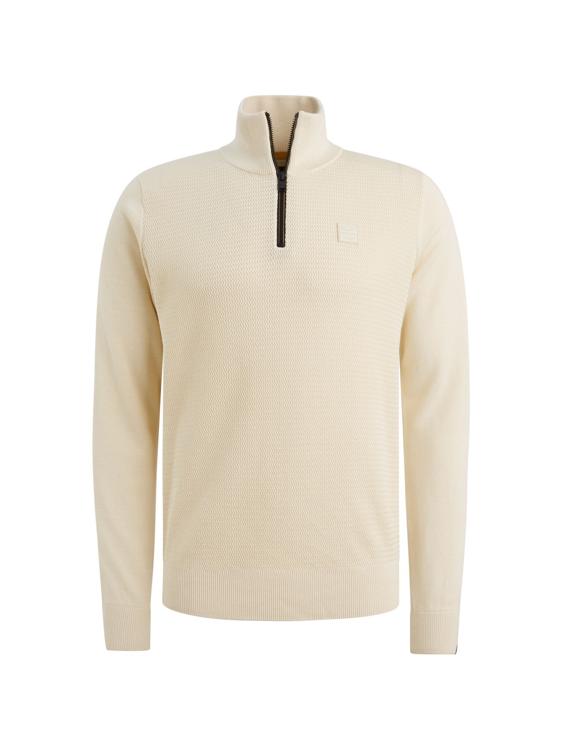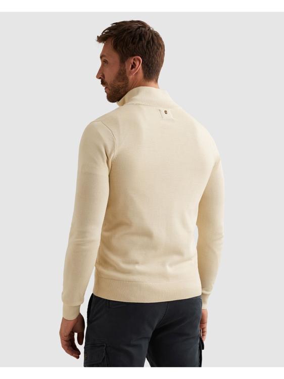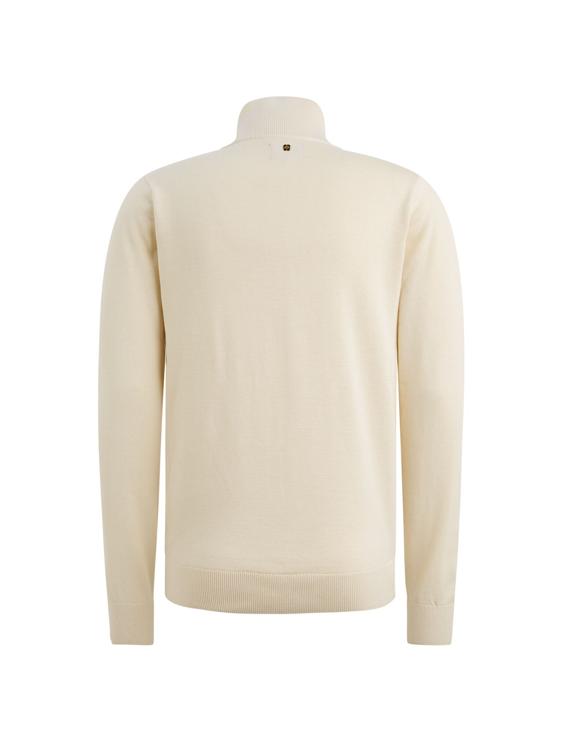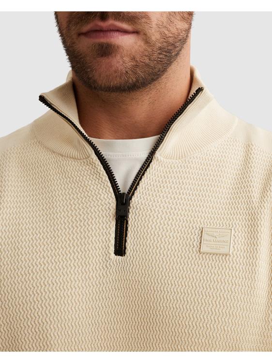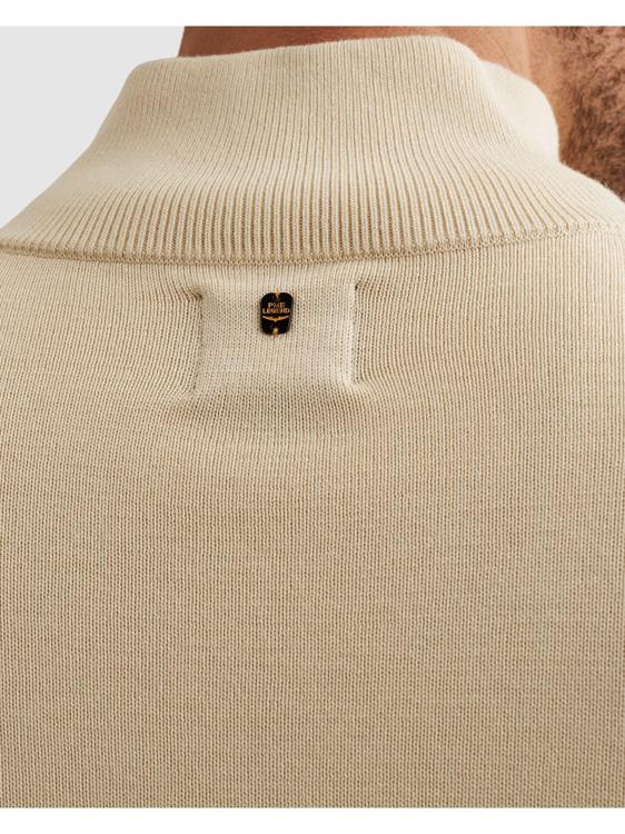 Deze beige gebreide trui van PME Legend heeft een stoere uitstraling door de contrasterende zwarte rits bij de kraag. Het kledingstuk heeft lange mouwen en een opstaande kraag die je dicht kunt ritsen voor extra comfort. De fijngebreide structuur geeft de pullover een verfijnde textuur. Op de linkermouw zie je het kenmerkende PME Legend logo verwerkt.