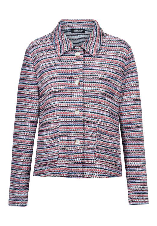 Deze elegante blazer van Frank Walder combineert verfijnde textuur met levendige kleurenpatronen. Het jasje toont een doorlopend patroon van horizontale strepen in roze, blauw, wit en zwart tinten die een tweed-achtige structuur vormen. De blazer heeft lange mouwen, een klassieke revers en sluit met knopen aan de voorzijde. Het getailleerde model zorgt voor een vrouwelijke pasvorm die je silhouet mooi volgt.