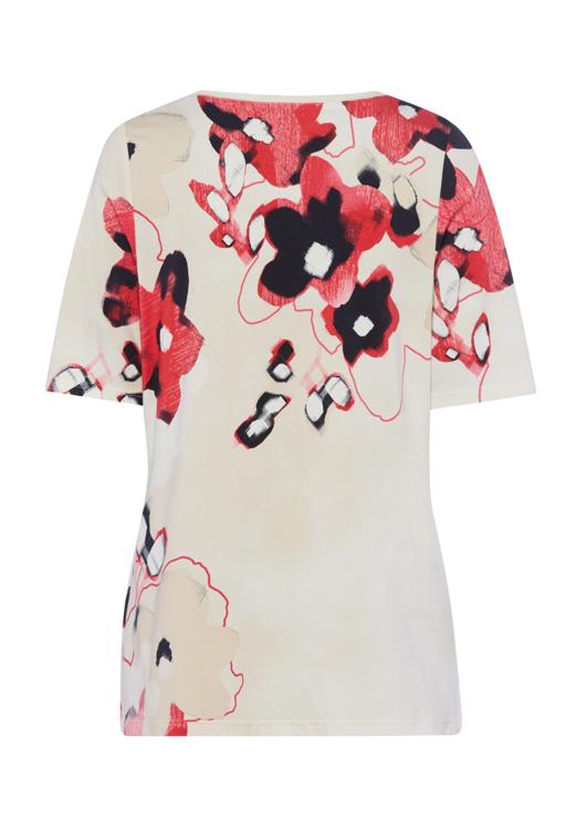 Dit lichte t-shirt van Frank Walder combineert comfort met een opvallende bloemenprint in rood, roze en zwart. Het shirt heeft een ronde halslijn en korte mouwen die je armen vrij laten bewegen. De zachte stofmix van katoen, modal en elastaan voelt prettig aan op je huid en behoudt zijn vorm, ook na regelmatig dragen. Het artistieke bloemendessin geeft dit basic shirt een elegante uitstraling die past bij verschillende gelegenheden.
