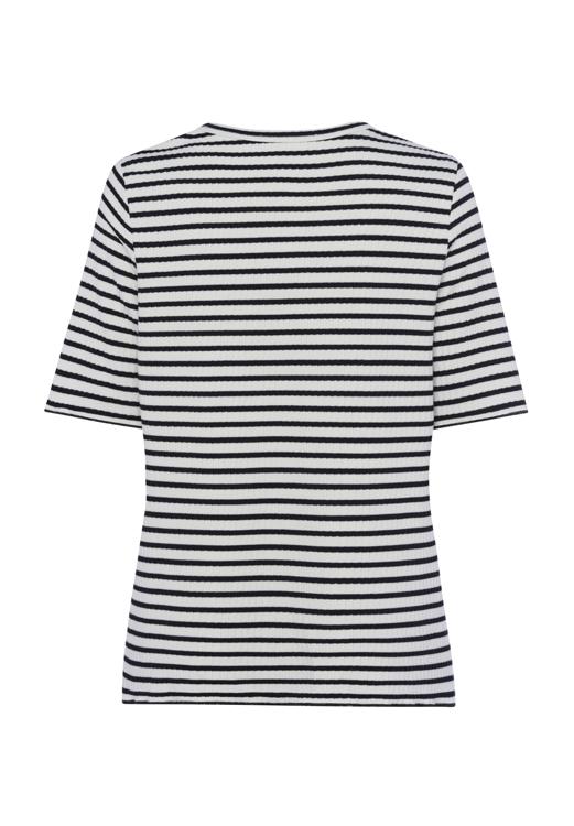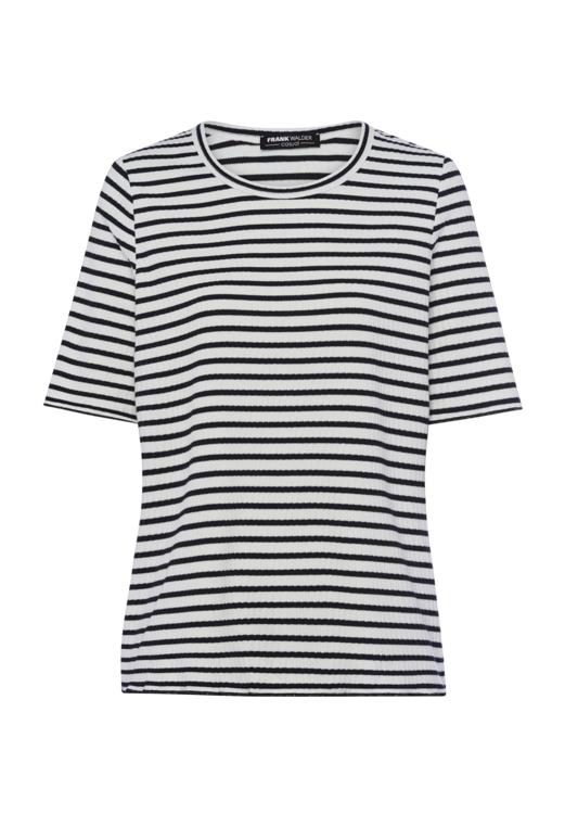 Dit Frank Walder T-Shirt combineert makkelijk met verschillende kledingstukken uit je garderobe. Draag het shirt bij een effen broek of rok voor een verzorgde look. De zwart-witte strepen passen bij zowel donkere als lichte tinten. Voor een complete outfit combineer je dit damesshirt met een blazer of vest. Het Frank Walder shirt blijft door de materiaalmix comfortabel zitten gedurende de dag. De reguliere pasvorm geeft bewegingsvrijheid zonder dat het shirt te ruim valt.