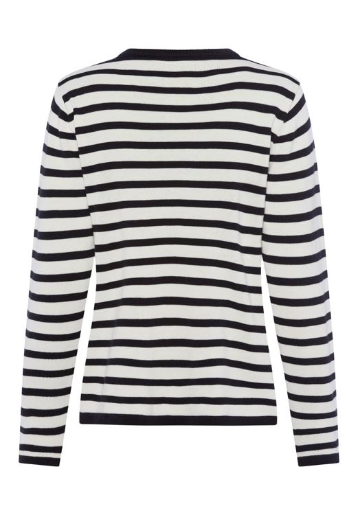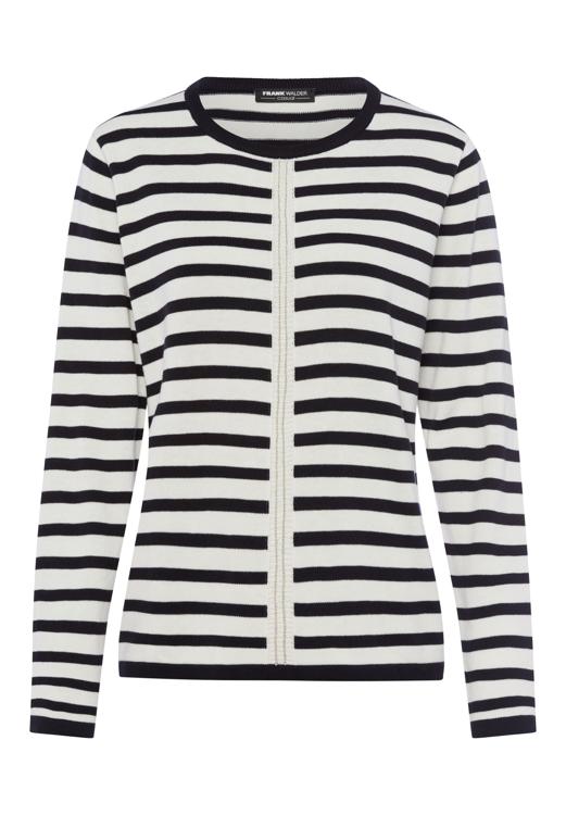 Dit gestreepte vest combineert klassieke zwart-witte strepen met een vrouwelijke uitstraling. Het vest heeft een ronde halslijn en sluit met een doorlopende knoopsluiting aan de voorzijde. De lange mouwen en de aansluitende pasvorm zorgen voor een verzorgde look. Het gebreide vest is gemaakt van een acryl-katoenmix die aangenaam draagt en zijn vorm goed behoudt. De horizontale strepen geven dit Frank Walder vest een tijdloze uitstraling.