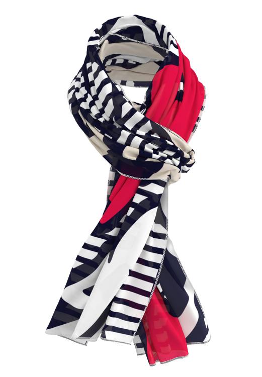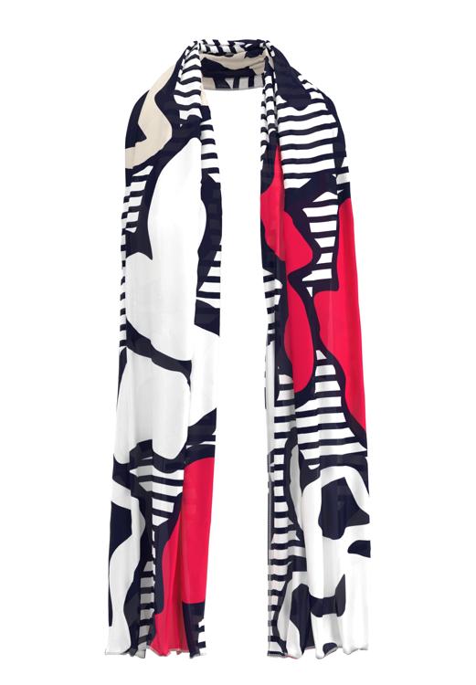Deze opvallende sjaal van Frank Walder combineert marine, wit en felrood in een modern grafisch dessin. Het abstract patroon bestaat uit geometrische vormen en strepen die vloeiend in elkaar overlopen. De rechthoekige sjaal is uitgevoerd in soepel vallend polyester, wat zorgt voor een lichte draagervaring en eenvoudig onderhoud.