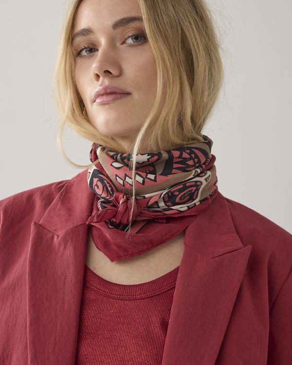 • 100% viscose satijn • Grafisch ornamentaal patroon • Vierkant model voor veelzijdig dragen • Warme roze en beige kleuren