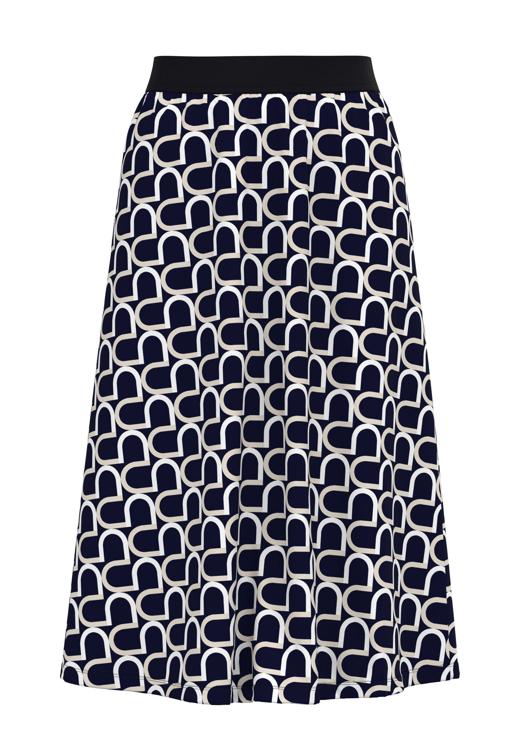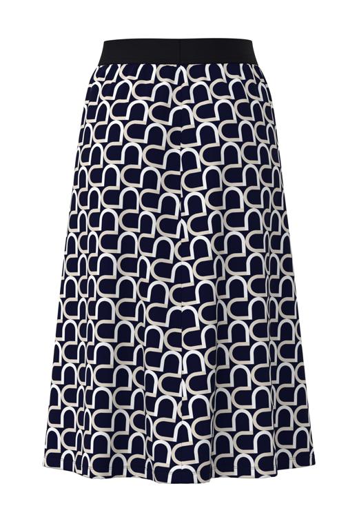 Deze donkerblauwe rok van Frank Walder valt direct op door het contrastrijke wit-blauwe geometrische patroon. De rok heeft een A-lijn silhouet dat vanaf de taille geleidelijk uitloopt. De elastische tailleband zorgt voor draagcomfort zonder knellende knopen of ritsen. Het polyester met elastane voelt licht aan en behoudt zijn vorm, zelfs na regelmatig dragen. De knielengte maakt deze rok veelzijdig voor verschillende gelegenheden.