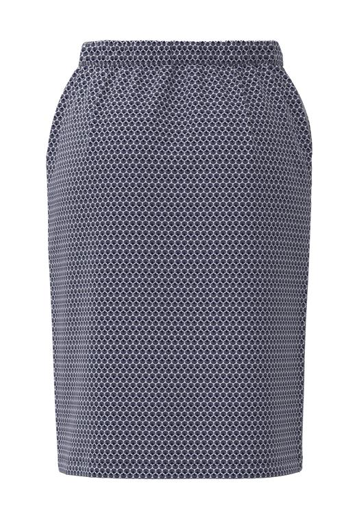 Deze kokerrok van Frank Walder valt op door het verfijnde grafische dessin in donkerblauwe en witte tinten. Het geometrische patroon geeft de rok een tijdloze uitstraling die je gemakkelijk combineert met verschillende bovenkleding. De rechte pasvorm valt tot net over de knie en heeft een comfortabele tailleband die je natuurlijke vormen volgt.