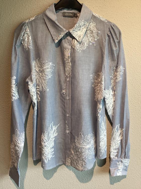 Deze lichtblauwe blouse met witte bloemenprint geeft je look een frisse uitstraling. De opvallende florale motieven zijn verspreid over de hele blouse en zorgen voor een vrolijk accent. Met lange mouwen en een klassieke puntkraag is dit item perfect voor de overgangsperiodes. De knoopsluiting aan de voorzijde maakt het dragen praktisch en comfortabel. Het 100% katoenen materiaal voelt zacht aan op je huid en ademt lekker door tijdens warmere dagen.