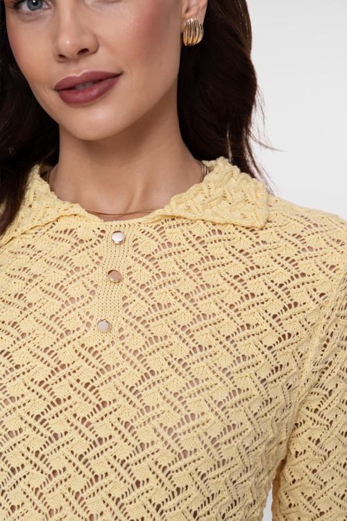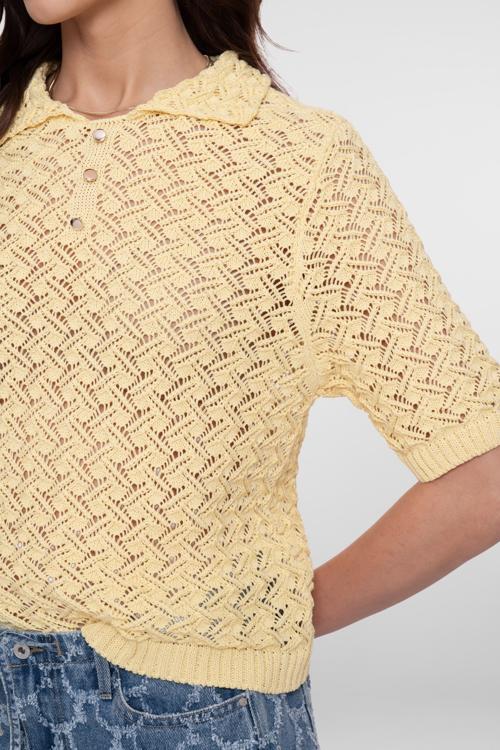 Deze lichtgele trui met korte mouwen heeft een trendy uitstraling door de opengewerkte breistof met zigzagstructuur. Het polokraagje met drie knopen geeft je dameskleding van Geisha een eigentijdse twist. De comfortabele mix van katoen en acryl voelt zacht aan en behoudt goed zijn vorm. De geribde boorden bij de mouwen en zoom zorgen voor een nette afwerking van deze veelzijdige trui.