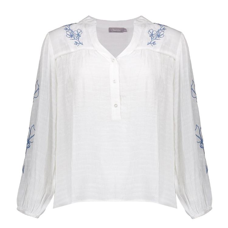 Deze elegante blouse in helder wit heeft een opvallend design met blauwe geborduurde bloemmotieven. De V-hals met knoopsluiting aan de voorzijde geeft het kledingstuk een verfijnde uitstraling. De lange mouwen zijn voorzien van decoratieve borduursels langs de armen en eindigen in een elastische boord voor extra comfort. Het luchtige silhouet met subtiele plooien vanaf het borstniveau zorgt voor een vrouwelijke pasvorm.