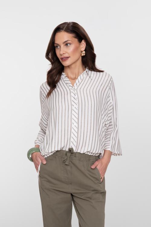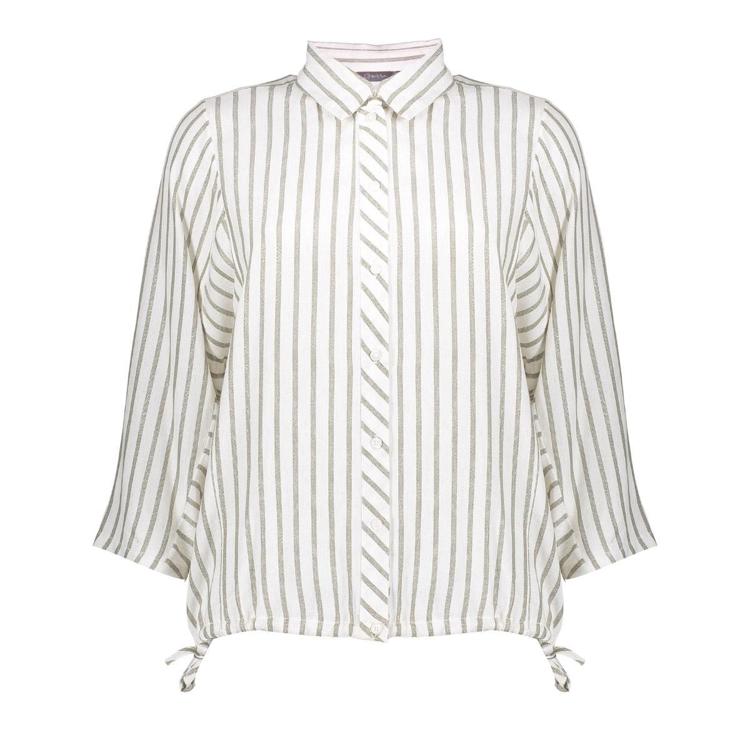 Deze stijlvolle blouse in wit met subtiele strepen biedt je een veelzijdige basis voor je garderobe. Het model heeft een klassieke kraag en doorlopende knoopsluiting aan de voorkant, wat zorgt voor een nette uitstraling. De driekwart mouwen met brede manchetten geven de blouse een eigentijdse twist. Dankzij de ecovero viscose mix voelt het materiaal zacht aan op je huid en ademt het prettig. De losse pasvorm met afgeronde zoom geeft je volop bewegingsvrijheid zonder dat je inlevert op stijl.