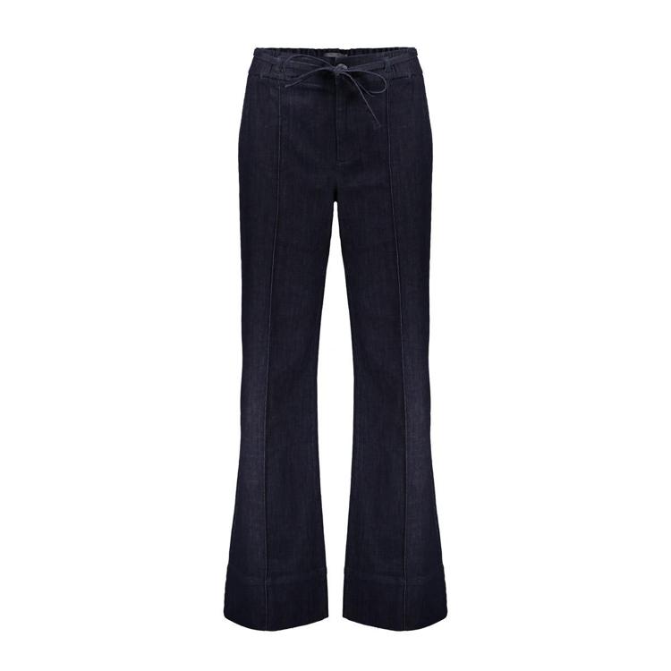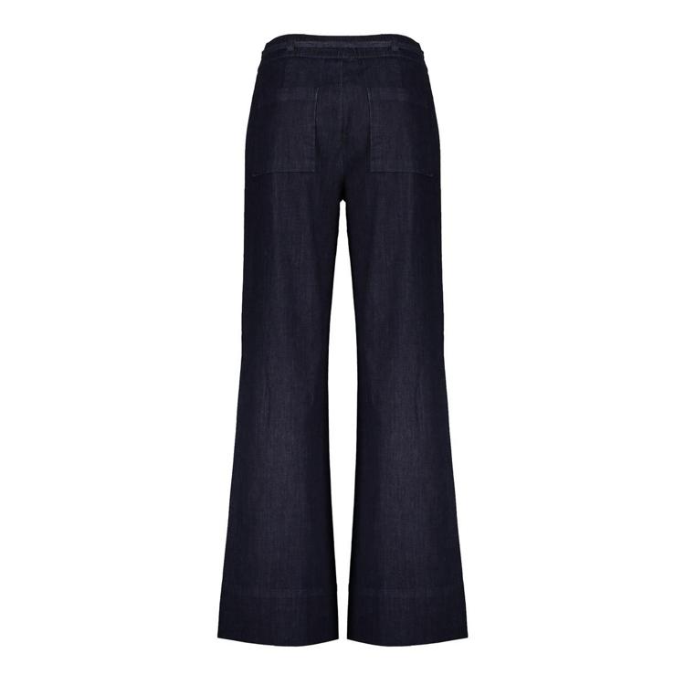 Deze donkerblauwe flared jeans combineert actuele modetrends met draagcomfort. Het model heeft een opvallende uitlopende pijp die je benen optisch verlengt. De elastische tailleband met aantrekkoord biedt extra comfort en zorgt voor een perfecte pasvorm. Door het katoen-polyester mengsel met toegevoegd viscose en elastaan voelt de broek soepel aan en beweegt ze met je mee. Het materiaal behoudt zijn vorm, ook na veelvuldig dragen.