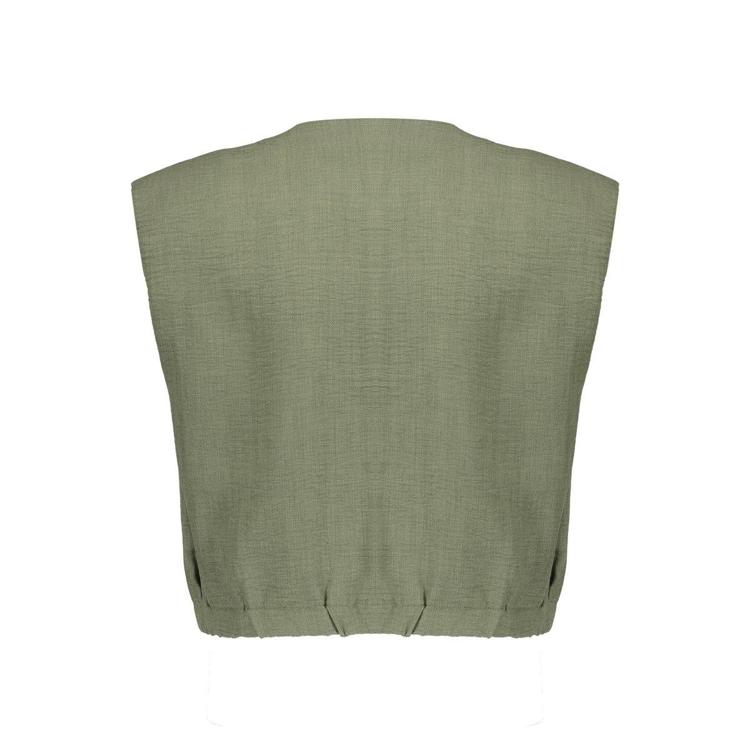 Deze mouwloze blouse in khakigroen biedt je een veelzijdige basis voor je garderobe. De blouse heeft een ronde halslijn en sluit met een knoopsluiting over de gehele lengte aan de voorzijde. Twee opgestikte borstzakken met knoop geven het ontwerp een trendy utility-look. Het polyester materiaal voelt licht aan en droogt snel na het wassen. De cropped lengte met elastische zoom onderaan zorgt voor een eigentijdse silhouet dat je taille subtiel accentueert.