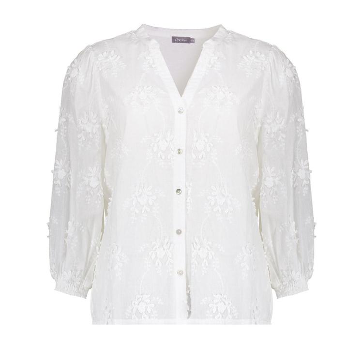 Deze witte blouse met broderie anglaise is een eigentijds kledingstuk dat je garderobe een creatieve twist geeft. De romantische geborduurde bloemen details over de driekwart pofmouwen en voorzijde zorgen voor een vrouwelijke uitstraling. De blouse heeft een V-hals met knoopsluiting en elastische manchetten die comfortabel zitten. Door de combinatie van katoen aan de voorkant en viscose-polyester mix aan de achterzijde draagt deze blouse luchtig en valt soepel. Het merk Geisha staat bekend om trendy dameskleding met opvallende details.