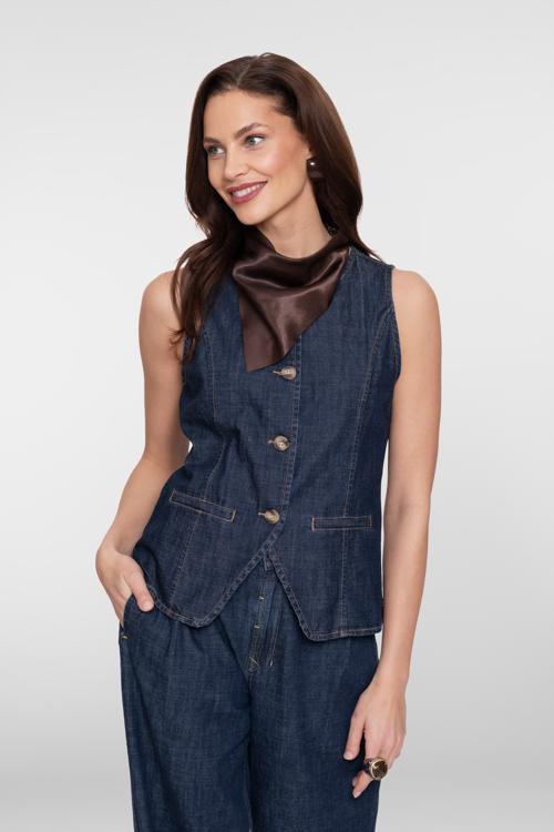 Deze mouwloze denim top in diepblauwe kleur combineert eigentijdse stijl met draagcomfort. De top heeft een ronde halslijn en sluit aan de voorkant met vier opvallende knopen. Het getailleerde model accentueert je silhouet op een natuurlijke manier. Gemaakt van 100% katoen, voelt het kledingstuk zacht aan op je huid en is het ademend tijdens warmere dagen.