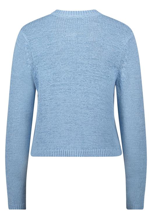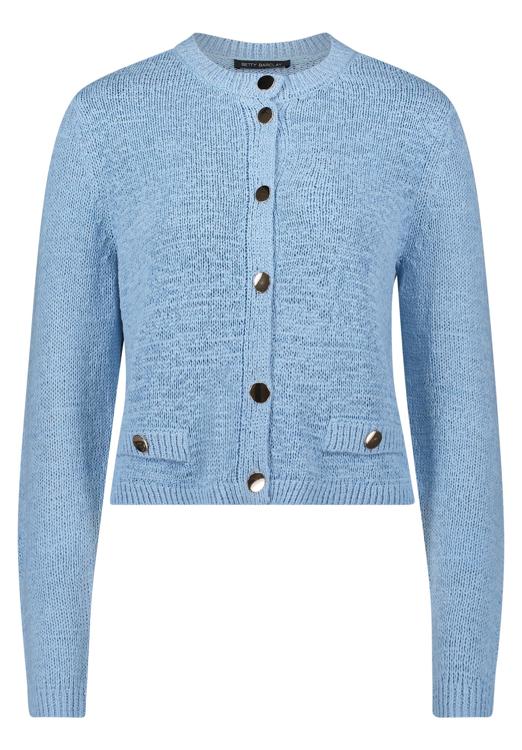 Dit lichtblauwe vest van Betty Barclay heeft een tijdloze uitstraling dankzij de verfijnde gebreide structuur. Het vest valt kort tot op de taille en heeft lange mouwen met comfortabele boorden. De ronde hals en knoopsluiting met zes donkere knopen zorgen voor een klassieke afwerking. Twee opgestikte zakken met decoratieve knopen aan de voorzijde geven het vest een functioneel accent. De acryl-polyamide mix voelt zacht aan op je huid en houdt je aangenaam warm zonder zwaar aan te voelen.