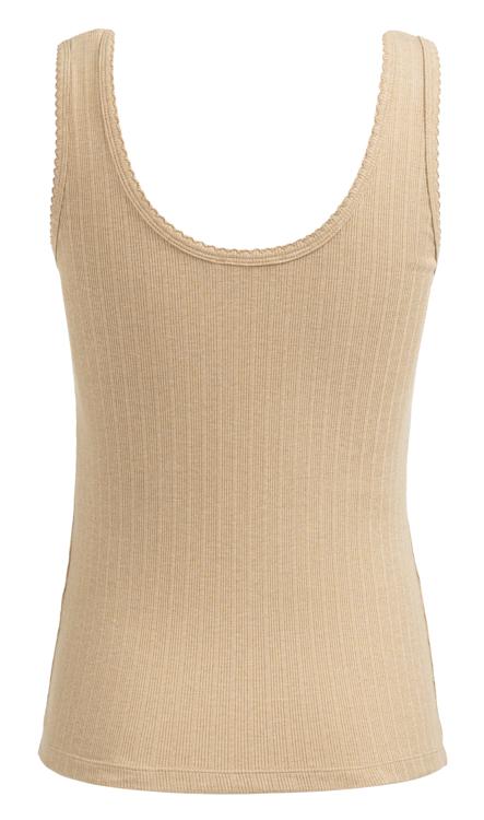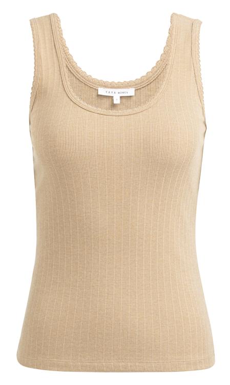 Deze beige mouwloze top heeft een geribbelde structuur die je het hele seizoen door kunt dragen. Het model heeft een ronde halslijn met decoratieve randafwerking en valt recht langs het lichaam. De combinatie van katoen, modal en elastaan zorgt voor een zacht draaggevoel dat meebeweegt met je lichaam. Door de neutrale tint combineer je deze top van Yaya gemakkelijk met verschillende items uit je garderobe.