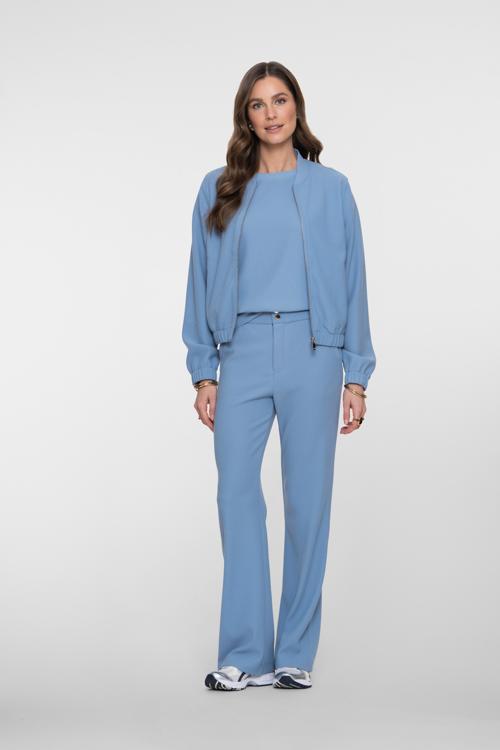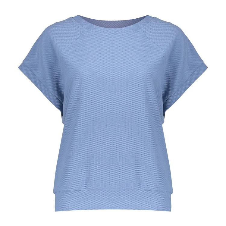 Deze lichtblauwe top biedt je een frisse uitstraling met vrouwelijke details. Het kledingstuk heeft korte, wijd uitlopende mouwen die mooi over je schouders vallen. De ronde halslijn geeft een zachte uitstraling, terwijl de raglanmouwen zorgen voor extra bewegingsvrijheid. De subtiele textuurstructuur in de stof voegt een interessant detail toe aan dit veelzijdige item.