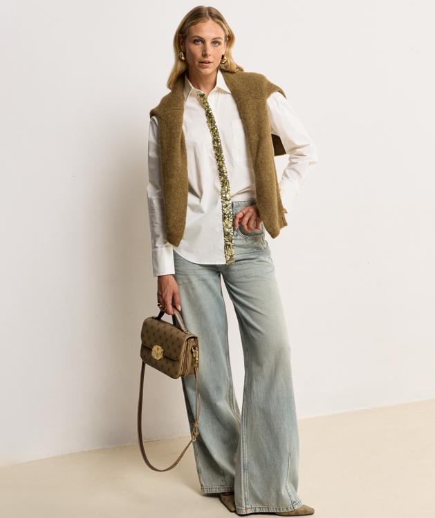 Dit Josh V item is een high waist denim broek in een lichte wassing. De jeans heeft een recht, wijdvallend silhouet en is afgewerkt met een zichtbare dubbele knoopsluiting en een rits. De tailleband bevat decoratieve, goudkleurige details aan weerszijden. Vervaardigd uit 100% katoen, wat zorgt voor een stevig maar ademend draagcomfort. De pijpen zijn voorzien van een korte split aan de onderzijde, en de broek heeft de klassieke five-pocket indeling.