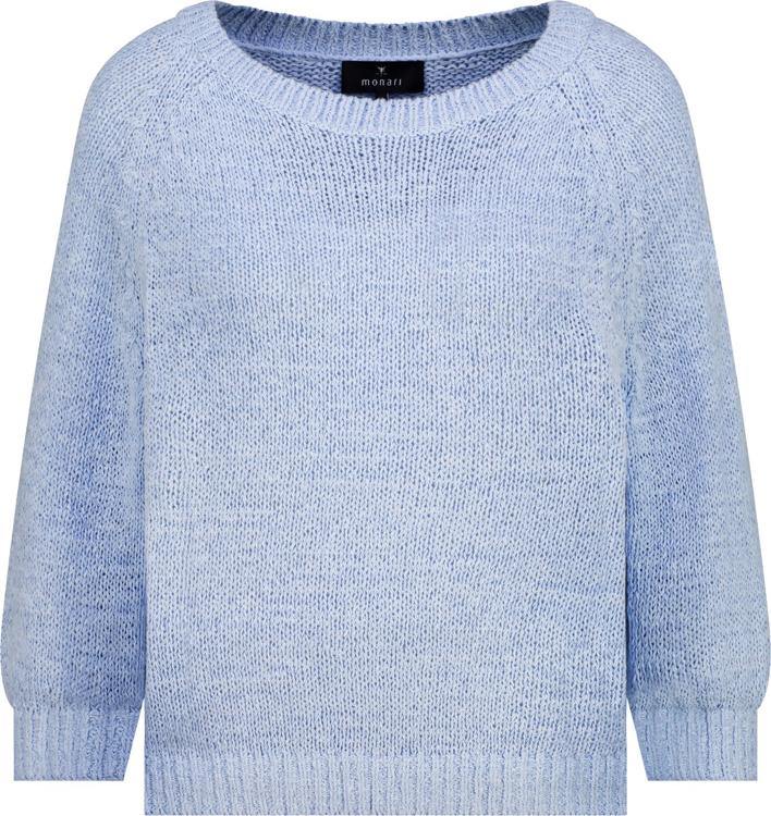 Deze lichtblauwe gebreide trui van Monari heeft een zachte, verfijnde uitstraling die je garderobe direct een stijlvolle update geeft. De trui heeft een klassieke ronde hals en driekwart pofmouwen die elegant zijn afgewerkt met geribde boorden. Het katoen-polyester mix materiaal voelt comfortabel aan op je huid en behoudt zijn vorm, ook na meerdere wasbeurten. De lichtblauwe kleur geeft deze damestrui een frisse, moderne look die het hele jaar door te dragen is. De relaxte pasvorm zorgt voor bewegingsvrijheid zonder dat het oversized oogt.