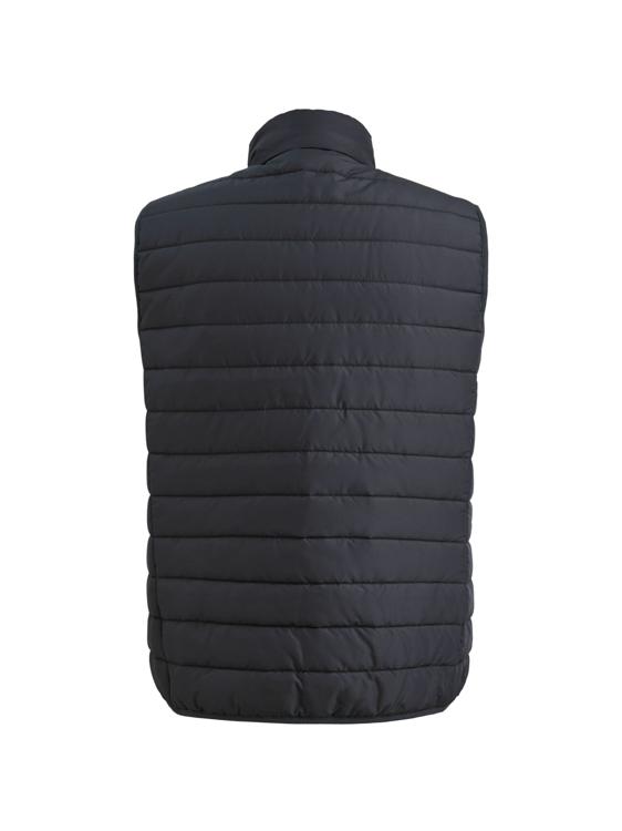 Deze donkerblauwe bodywarmer kenmerkt zich door een doorgestikte voering met horizontale stiknaden die zorgen voor een stoere uitstraling. De opstaande kraag met doorritsbare sluiting biedt extra bescherming tegen de wind. Op de linkerborstzijde is een klein logo-embleem bevestigd dat subtiel het merk accentueert. Het mouwloze ontwerp maakt deze bodywarmer ideaal als tussenlaag.
