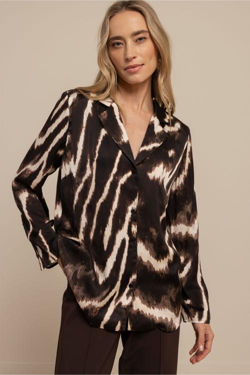 • Viscose buitenstof met polyester voering 100% viscose buitenstof, 100% polyester voering • Rechte pasvorm met reverskraag • Bruine dierenprint in abstract dessin • Enkele knoopsluiting voorpand • Lange mouwen met manchetten