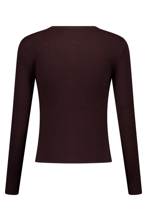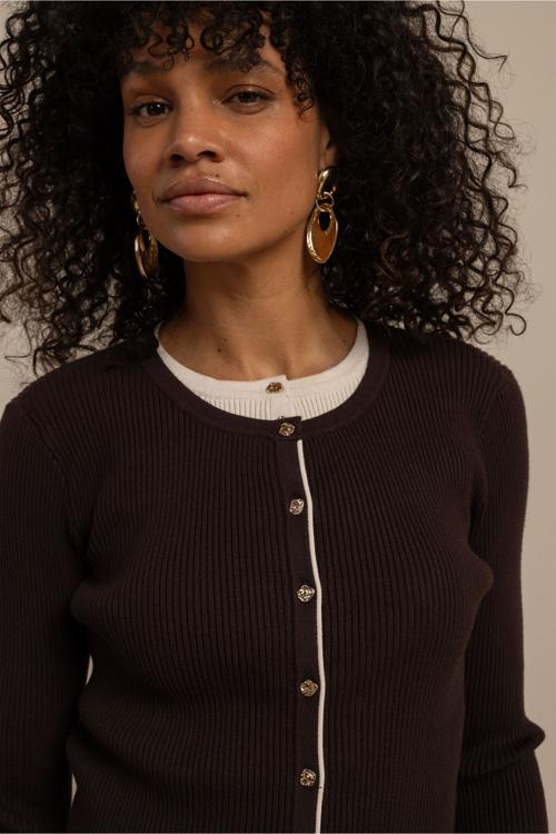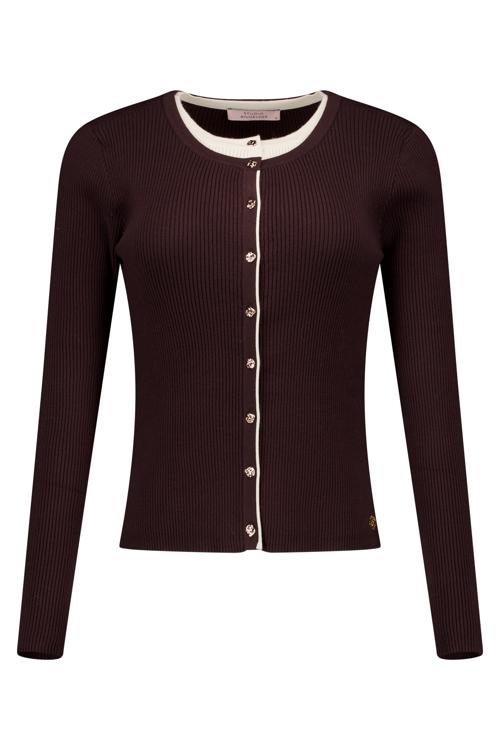 Dit geribde vest in bordeaux biedt je een verfijnde toevoeging aan je garderobe. Het vest heeft lange mouwen en een ronde halslijn met contrasterende lichte biesafwerking die doorloopt langs de knoopsluiting. De doorlopende knopenrij met goudkleurige knopen geeft het vest een chique uitstraling. Dankzij de viscose-polyester mix voelt het vest zacht en comfortabel aan, terwijl de geribde structuur voor een mooie pasvorm zorgt.