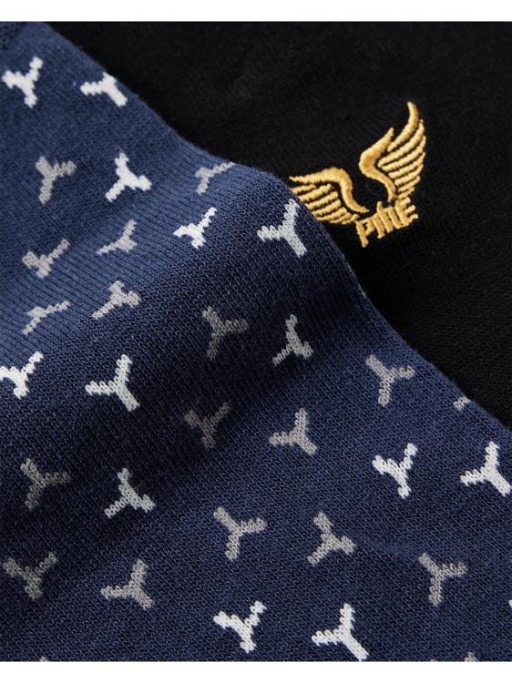 Deze sokkenset van PME Legend bestaat uit twee paar herensokken in zwart en donkerblauw. Het zwarte exemplaar heeft een gouden vleugellogo op de schacht, terwijl de blauwe sok voorzien is van een wit vogelprint over het hele oppervlak. Beide sokken hebben verstevigde hielen en tenen voor extra draagcomfort. Het PME Legend logo staat onderaan de voetzool gedrukt.