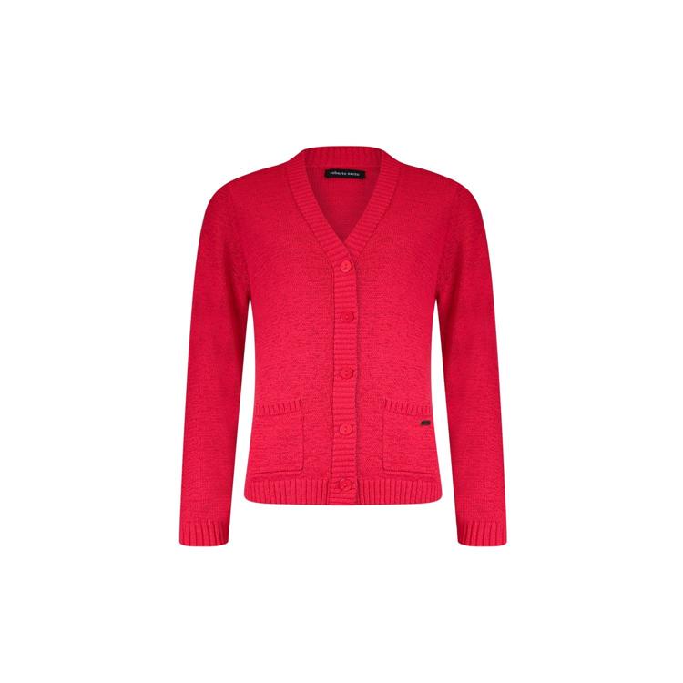 Dit rode vest van Roberto Sarto heeft een klassieke V-hals en doorlopende knoopsluiting. De lange mouwen en geribde boorden zorgen voor een comfortabele pasvorm. Twee opgestikte zakken aan de voorzijde geven het kledingstuk een praktisch accent. Het gebreide materiaal voelt zacht aan en biedt warmte voor koelere dagen.