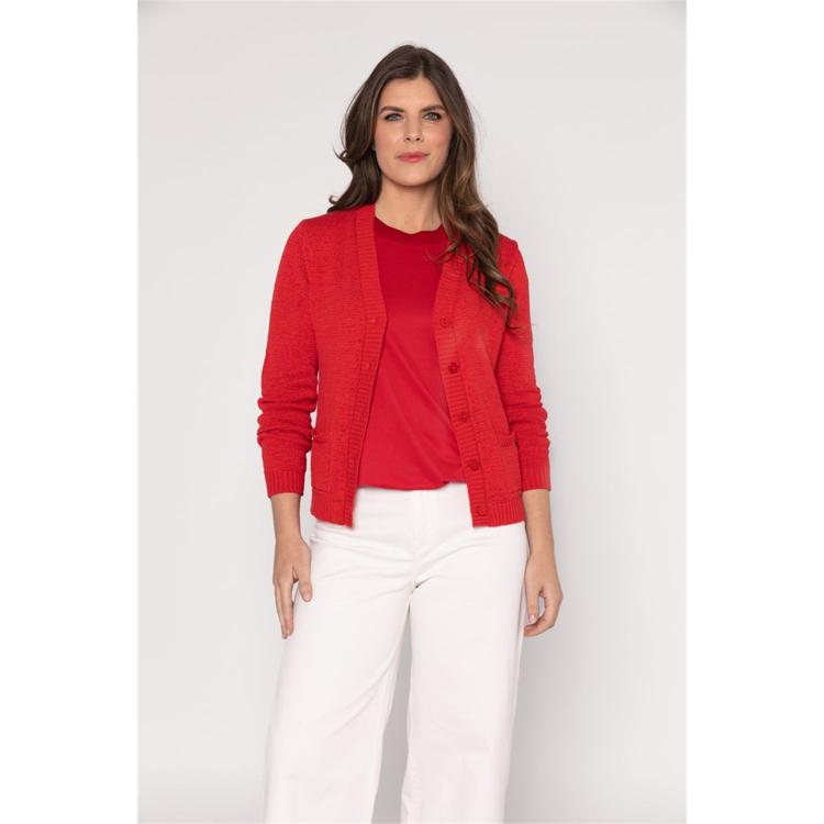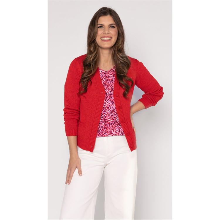 De Roberto Sarto Trui 611120-R255 combineert je eenvoudig met een witte broek voor een frisse look. Dit rode damesvest past uitstekend bij een gebloemde blouse zoals zichtbaar op de foto. Het vest van Roberto Sarto kleding werkt ook mooi over een effen shirt in zachte tinten. Voor een elegante uitstraling draag je deze gebreide cardigan met een donkere pantalon. De veelzijdige rode kleur maakt dit knitwear geschikt voor verschillende gelegenheden, van casual tot zakelijk.