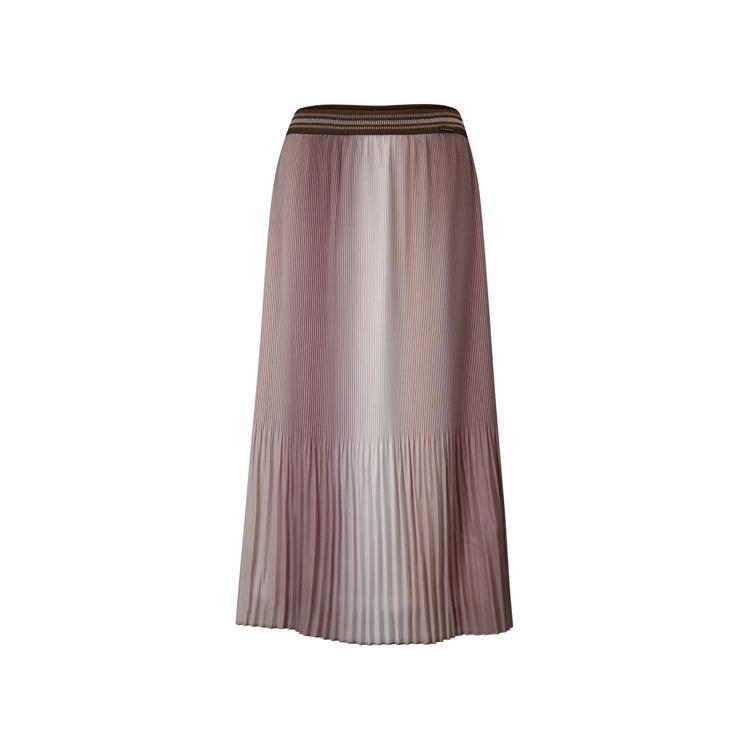 Deze elegante rok van Roberto Sarto valt direct op door de verfijnde kleurstelling in zachtroze met bruine accenten. De elastische tailleband in contrasterende bruine tint zorgt voor een comfortabele pasvorm. Het onderste deel van de rok is voorzien van fijne plissés die voor een speelse beweging en vrouwelijke uitstraling zorgen.