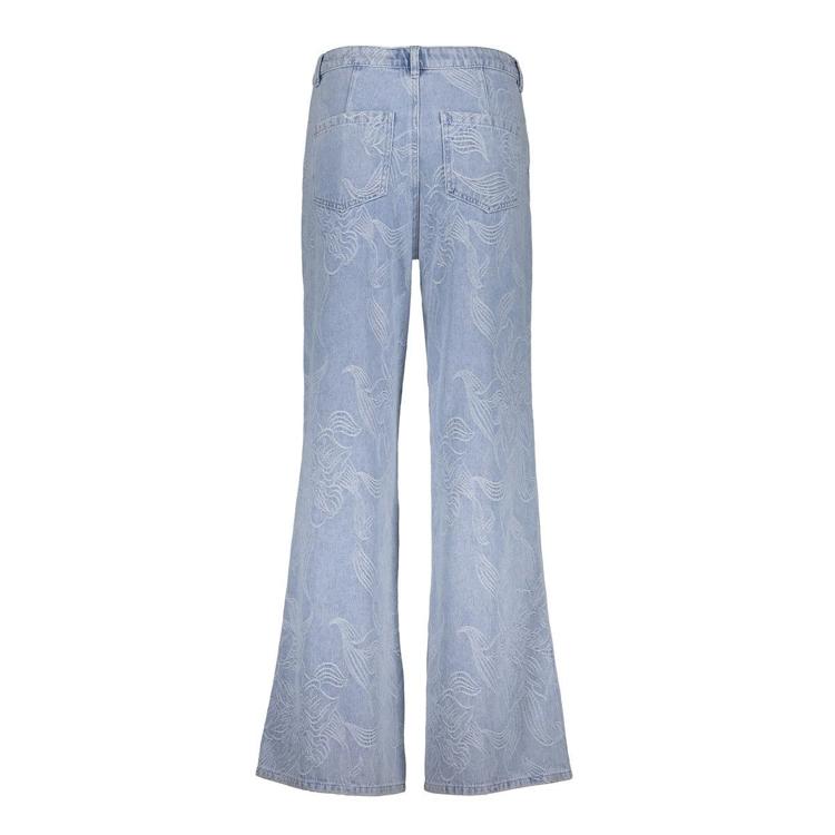 Deze lichtblauwe jeans combineert comfort met een trendy silhouet. De broek heeft een opvallende wijde pijp die vanaf de knie uitloopt tot een flared vorm. Het subtiele palmblad patroon over de gehele stof geeft deze damesbroek een creatieve twist. De katoen-polyester mix (85% cotton, 15% polyester) voelt aangenaam zacht aan op je huid en behoudt goed zijn vorm tijdens het dragen.