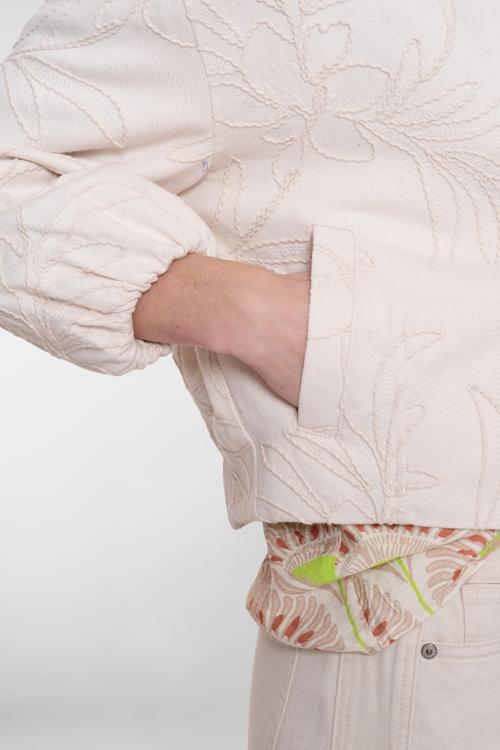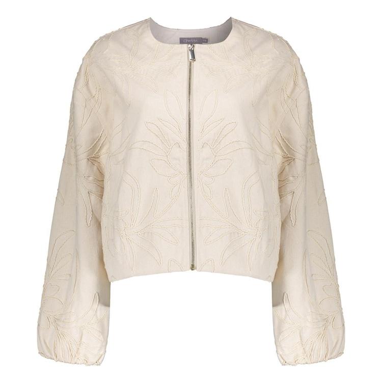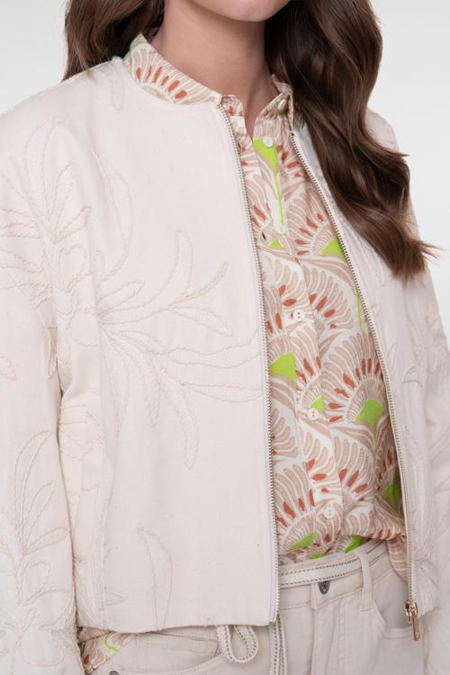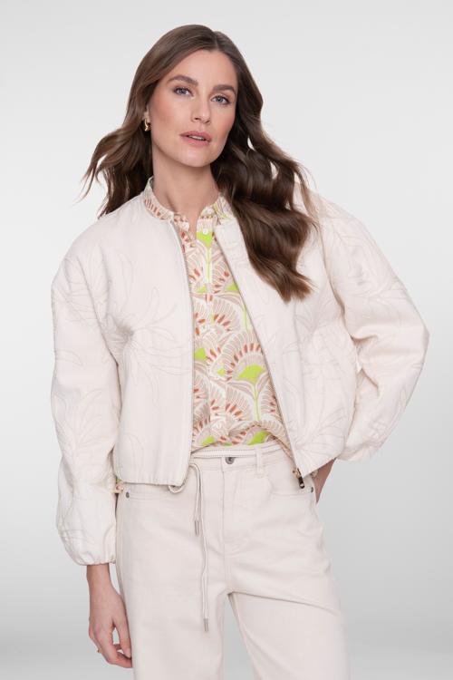 Dit korte bomberjack in zachte crèmekleur combineert comfort met een opvallend bladdessin. De subtiele bladprint geeft het jack een creatieve uitstraling die past bij jouw persoonlijke stijl. Het 100% katoen voelt heerlijk licht aan op je huid en ademt prettig door tijdens wisselende temperaturen. De ronde hals zonder kraag zorgt voor een vrouwelijke uitstraling, terwijl de doorlopende ritssluiting praktisch is bij het aan- en uittrekken. De ballonmouwen met elastische boorden geven het jack extra volume en een trendy silhouet. Het elastiek onderaan sluit mooi aan rond je taille voor een flatterende pasvorm.