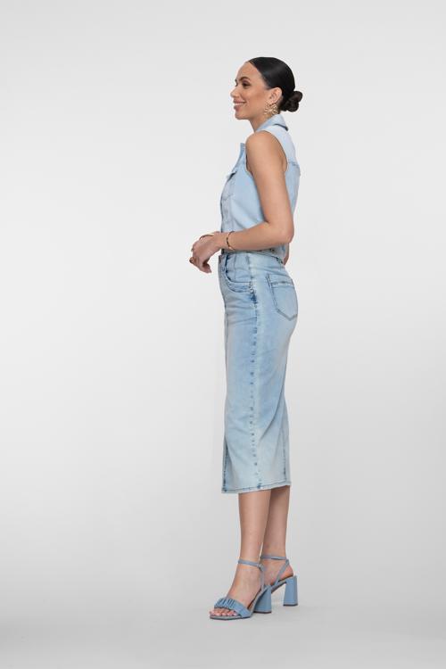 Combineer deze veelzijdige Geisha Rok 66007-10 met een witte blouse voor een frisse zomerlook of draag hem met een gebreide trui tijdens koelere dagen. De lichtblauwe tint past uitstekend bij zowel neutrale tinten als levendige kleuren uit je garderobe. Door de midi-lengte kun je deze dameskleding van Geisha dragen met sneakers voor overdag of met hakken voor een meer geklede uitstraling. De split zorgt ervoor dat je comfortabel blijft bewegen, of je nu naar werk gaat of een terrasje pakt.