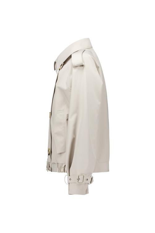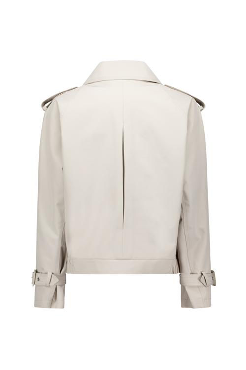 Deze beige jas heeft een kortere pasvorm die net over de heupen valt. De dubbele rij goudkleurige knopen geeft het model een klassieke uitstraling, terwijl de schouderklappen en gespdetails bij de mouwen en taille voor een stoere touch zorgen. De brede revers en het rechte silhouet maken deze jas tot een veelzijdig kledingstuk voor verschillende gelegenheden. Het materiaal heeft een gladde afwerking en de kleur is neutraal genoeg om bij veel outfits te passen.