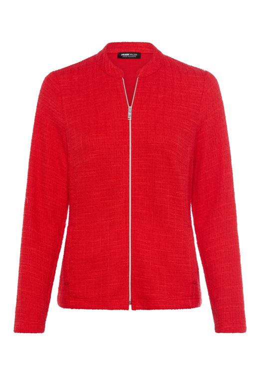 Dit rode vest van Frank Walder combineert comfort met een verzorgde uitstraling. Het kledingstuk heeft lange mouwen en sluit met een doorlopende ritssluiting aan de voorzijde. De materiaalsamenstelling van polyester, katoen en viscose zorgt voor een aangenaam draaggevoel en maakt het vest gemakkelijk in onderhoud. De opstaande kraag geeft dit exemplaar een eigentijdse touch.