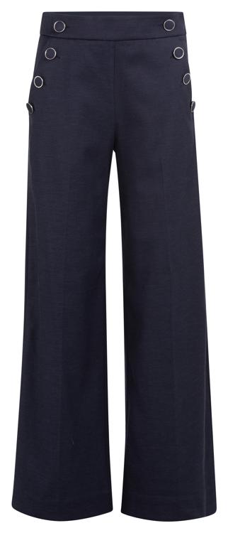 Deze donkerblauwe wijde broek van Yaya heeft een hoge taille met opvallende sierknopen aan de voorzijde. De brede pijpen geven de broek een vloeiende silhouet. Aan de achterzijde zitten paspelzakken voor een strakke afwerking. De mix van polyester, katoen, rayon en elastaan zorgt voor een zachte stof met lichte stretch, waardoor de broek de hele dag comfortabel zit.
