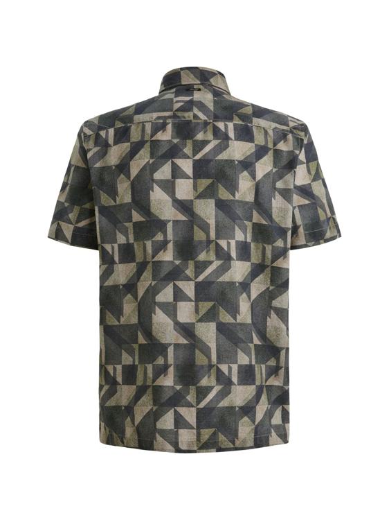 Dit kortemouwen overhemd van Vanguard valt op door het geometrische dessin in aardse groen- en grijstinten. De opvallende print van driehoeken en vlakken geeft het shirt een stoer en eigenzinnig karakter. Het overhemd heeft een klassieke kentkraag, knoopsluiting aan de voorzijde en een borstzakje met klep. De korte mouwen en rechte snit zorgen voor een relaxte pasvorm.