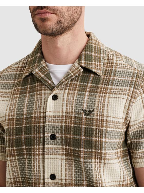 Dit geruite overhemd van PME Legend combineert een aardse kleurstelling van groen, bruin en crème met een opvallend ruitpatroon. De korte mouwen en open reverskraag geven het shirt een relaxte uitstraling. De knoopsluiting aan de voorzijde wordt afgewerkt met donkere contrastknopen. Op de borst zit een klein PME Legend embleem dat het ontwerp subtiel signeert. De textuur van de stof toont een geweven dotpatroon binnen de ruiten, wat extra diepte geeft aan het dessin.